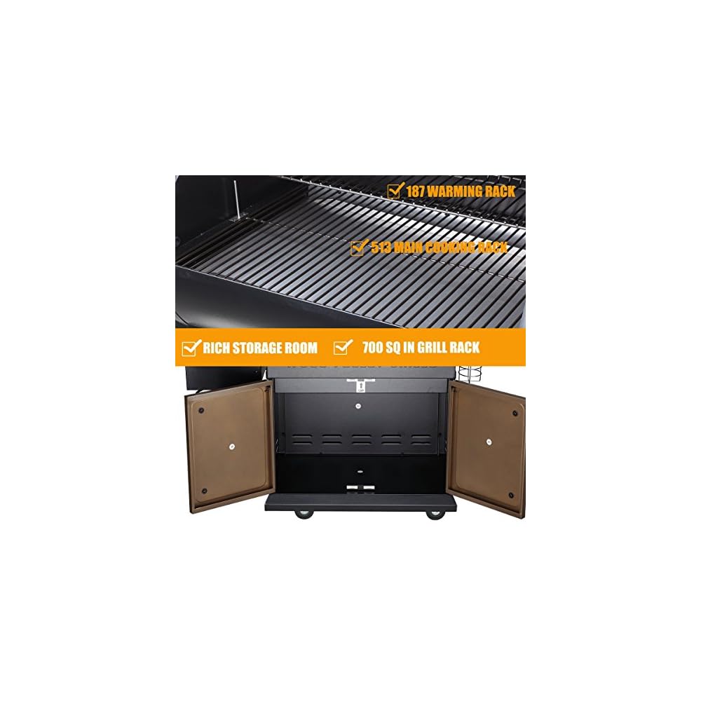 ✓Huge Grilling Area & Hopper Capacity—-513 sq in Main rack & 187 sq in Warm Rack, 20LB Hopper Capacity, Upgraded cart with locking caster wheels